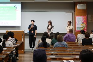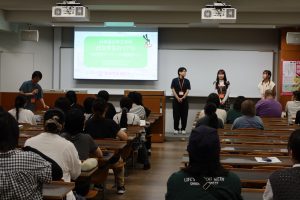キャンパスライフのリアルについて、日文の学生を対象に行われたアンケートをもとに、学生スタッフが自分の体験談などを交えて話しました。