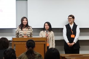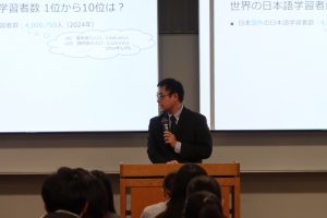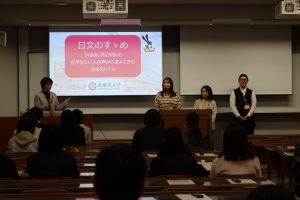 日文学科を選んだ理由、普段どのようなことを学んでいるのか、など語りました。